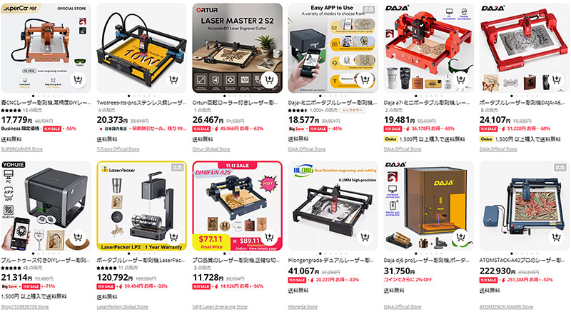 Aliexpressで「レーザー加工機」をキーワードに検索をすると多くの商品が表示されます。しかし、一つ一つを見ても他の機種とどう違うのか、同じような素材の加工も出来そうだ、、、と悩んでもしまいます。